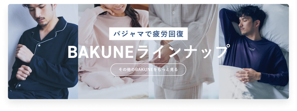 - だから、仕事でクタクタになった日も、BAKUNEを着て寝れば、次の日には、シャキーン! とできるかもよ?